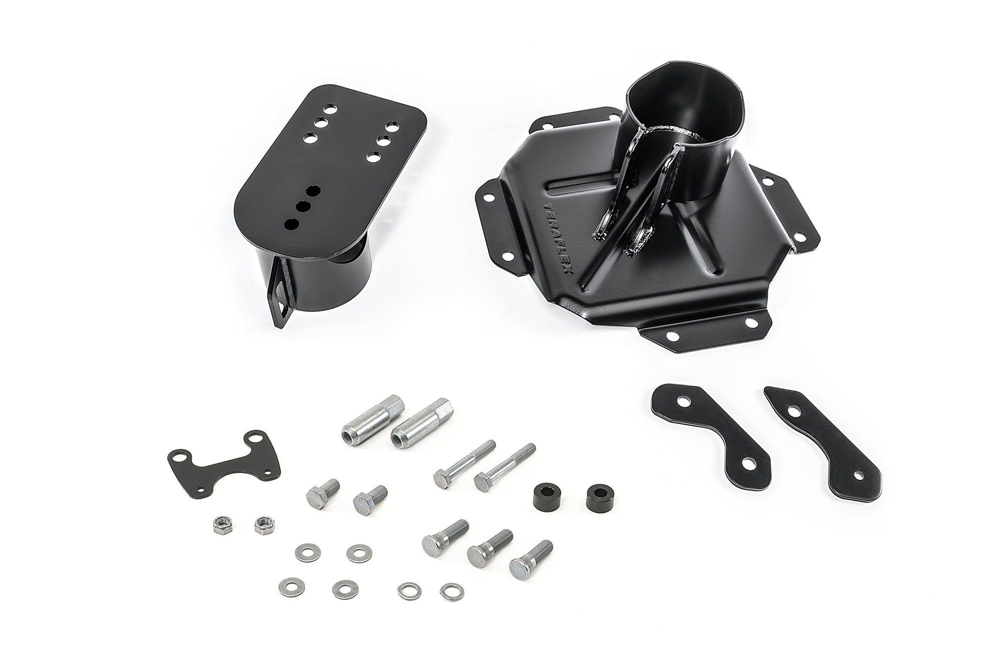 The TeraFlex Heavy Duty Adjustable Spare Tire Mount is designed to carry up to a 37″ tire when used in conjunction with the HD Hinged Carrier (see recommended below), a 35″ on the factory tailgate hinges. The adjustable tire mounting kit allows fine-tuning before and after spare tire position to keep it secured as close to the body as possible for maximum rear clearance. Multiple vertical mounting holes provide custom spare tire height to fit multiple rear bumper configurations and to keep the center of gravity as low as possible.