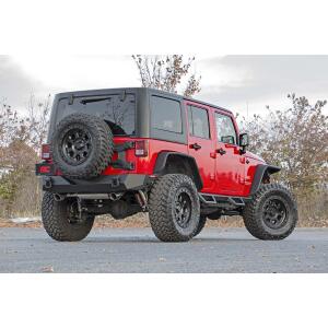 The factory JK tire carrier simply isn’t designed to withstand the size and weight of a larger, aftermarket tire and wheel.  Made of a durable, steel construction, this kit is designed to replace the weak factory joints while eliminating stress and rattle. Rough Country’s Heavy-Duty Hinged Tire Carrier Kit includes a reinforced hinge replacement system and an adjustable spare tire mount, allowing you to mount up to a 37in tire with plenty of clearance over a factory or aftermarket bumper. Each kit  also includes a 3rd brake relocation bracket to retain your factory brake light.