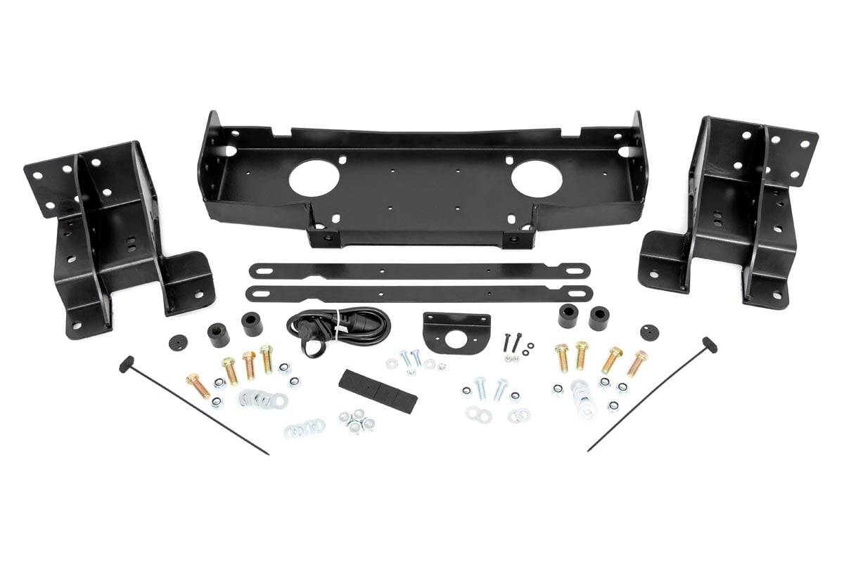 Give your Jeep a sleek recovery system that blends in seamlessly with the factory aesthetic with Rough Country’s WK2 Hidden Winch Mounting Kit! This convenient winch mounting kit allows you to upgrade your vehicle with any standard-sized winch, giving you the ability to make it out of any tough spots you may encounter while also adding a more interesting, aggressive look to the front end of your vehicle.Each Hidden Winch Mounting Kit includes a remote port relocation system that moves the terminal from beside the winch to just under the hood for easy operation without fumbling around underneath the vehicle.Each kit includes a handy template allowing you to create the fairlead route in no-time flat. Rough Country’s Hidden Winch Mounting Kit features a bolt-on installation process making it easy to upgrade your vehicle! This kit can accommodate most┬ásynthetic winches and┬áhawse fairleads. Upgrade your Jeep and be ready for recovery in an instant!