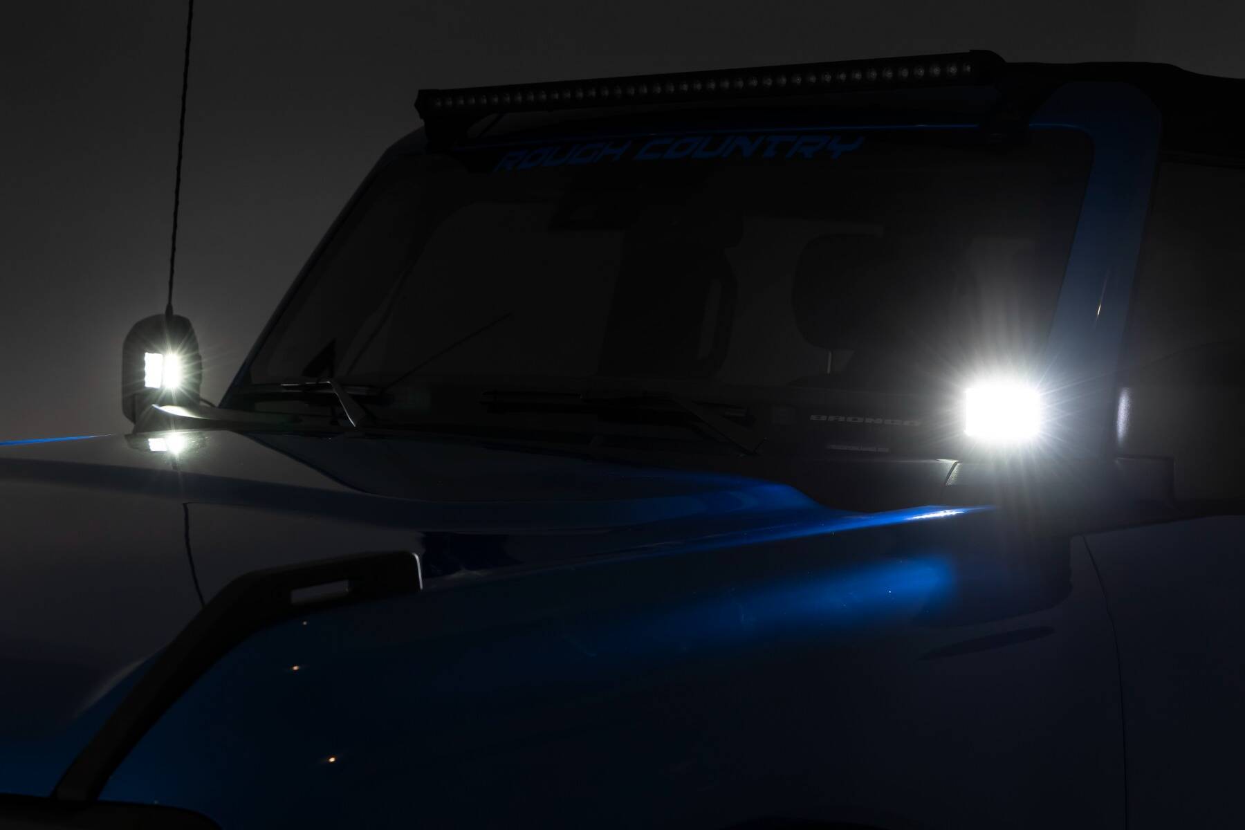 Rough Country’s LED Ditch Lights for the Ford Bronco bring powerful side visibility to your off-road experience. Safely navigate the trails after dark, enhancing your safety and awareness without compromising the aesthetic of your vehicle.Customize Your Lighting Experience: Choose from a variety of lighting options to suit your needs! Rough Country’s LED Ditch Lights for the Ford Bronco are available with the Black Series, Spectrum Series, OSRAM, Amber Lens, or DRL LED options, so you can tailor the setup to match your style and performance requirements. Whether you need a bold, sleek look or enhanced visibility in low-light conditions, there’s a perfect option for every off-road enthusiast.Weather-Resistant Performance: Built with an IP67 waterproof rating, these LED lights are ready for any weather condition, offering reliable performance even in the harshest environments.Rugged and Durable Construction: The die-cast aluminum housing ensures long-lasting durability and superior protection against wear and impact, while the moisture breather technology keeps your lights clear and bright for longer.Complete Lighting Kit: Each kit includes a premium, flat-wound wiring harness with an on/off switch, offering ease of use and quality you can depend on. Heavy-duty 11 gauge steel brackets ensure solid, long-term support for your lights.Quick and Easy Installation: Enjoy a smooth installation process with minimal drilling required. This kit offers a seamless fit with only slight modifications needed to ensure it integrates perfectly with your vehicle.Engineered for Adventure: Whether you’re cruising off-road at night or navigating through rough terrain, Rough Country’s LED Ditch Lights for the Ford Bronco give you the confidence to conquer any adventure with clarity and style.