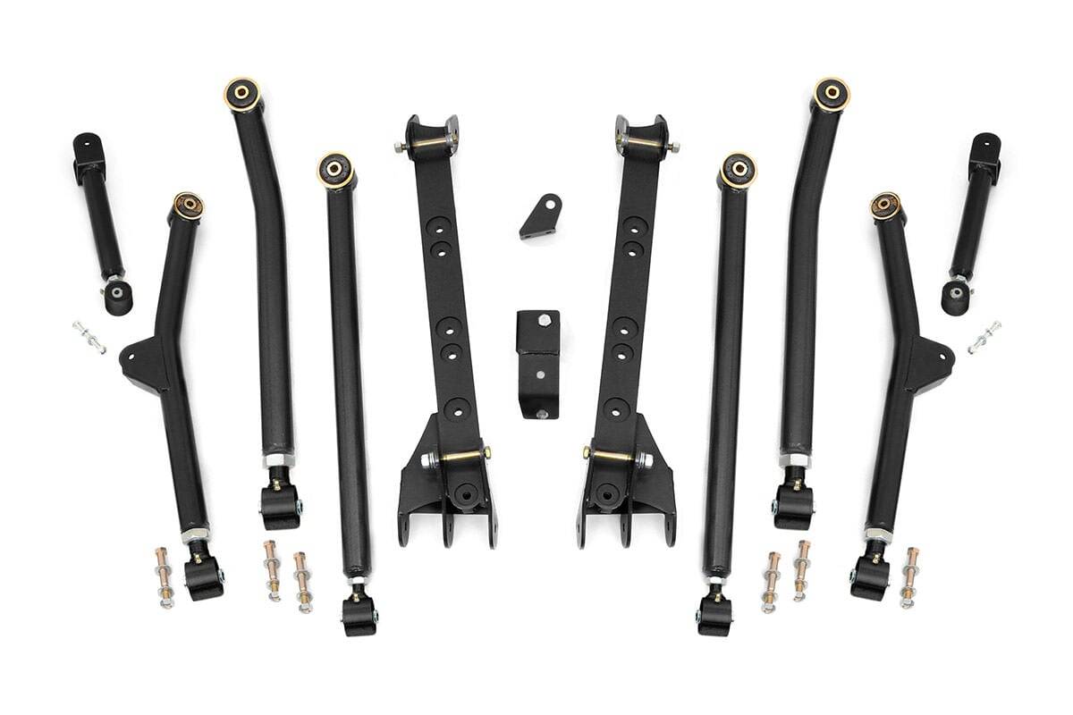 Transform your existing four or six inch kit with Rough Country’s Long Arm Upgrade for your 97-06 Jeep Wrangler. This kit features extreme travel long arms that assist in keeping optimum alignment and give optimum articulation. The X-flex control arms are fully greasable, and feature OEM style rubber bushings and have a massive 2.5″ diameter body and 1.25″ thread. The upper joints pivot up to 20 degrees, lower joints pivot up to 35 degrees.