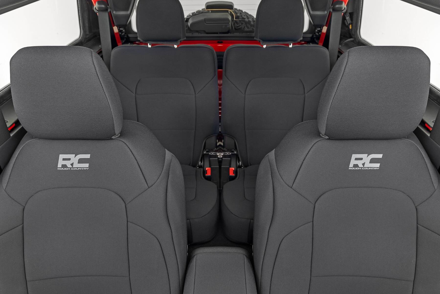 Want to protect your seats or are your seats showing signs of wear and tear from daily use? Say goodbye to unsightly stains and deterioration with Rough Country’s Neoprene Seat Covers – the ultimate solution for preserving your vehicle’s interior.Snug Fit for Optimal Protection: Our seat covers are tailored to fit your seats perfectly, providing a protective barrier against spills, scratches, and everyday wear and tear.Factory-Spec Construction: Engineered to meet factory specifications, our covers blend seamlessly with your vehicle’s interior, giving it a fresh, new look without compromising on quality or style.Four-Layer Defense: With a four-layer construction featuring foam padding and a durable polyester shell, our seat covers offer unmatched protection and longevity, ensuring your seats stay looking new for years to come.Breathable and Water-Resistant: The neoprene layer not only provides breathability for added comfort but also boasts water-resistant properties, safeguarding your seats from spills and stains.Complete Coverage: Our covers come with full protection for your front seats, including headrest covers where applicable, as well as rear covers to shield your back seats from children and pet-related mishaps.Peace of Mind Warranty: Rest easy knowing your purchase is backed by our two-year warranty, giving you confidence in the durability and reliability of our product.Don’t let worn-out seats diminish your driving experience. Upgrade to Neoprene Seat Covers today and enjoy a fresh, stylish interior that’s protected against the rigors of daily life on the road.