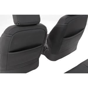 Want to protect your seats or are your seats showing signs of wear and tear from daily use? Say goodbye to unsightly stains and deterioration with Rough Country’s Neoprene Seat Covers – the ultimate solution for preserving your vehicle’s interior.Snug Fit for Optimal Protection: Our seat covers are tailored to fit your seats perfectly, providing a protective barrier against spills, scratches, and everyday wear and tear.Factory-Spec Construction: Engineered to meet factory specifications, our covers blend seamlessly with your vehicle’s interior, giving it a fresh, new look without compromising on quality or style.Four-Layer Defense: With a four-layer construction featuring foam padding and a durable polyester shell, our seat covers offer unmatched protection and longevity, ensuring your seats stay looking new for years to come.Breathable and Water-Resistant: The neoprene layer not only provides breathability for added comfort but also boasts water-resistant properties, safeguarding your seats from spills and stains.Complete Coverage: Our covers come with full protection for your front seats, including headrest covers where applicable, as well as rear covers to shield your back seats from children and pet-related mishaps.Peace of Mind Warranty: Rest easy knowing your purchase is backed by our two-year warranty, giving you confidence in the durability and reliability of our product.Don’t let worn-out seats diminish your driving experience. Upgrade to Neoprene Seat Covers today and enjoy a fresh, stylish interior that’s protected against the rigors of daily life on the road.